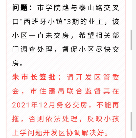 多次维权后,西班牙小镇停工问题被当地政府部门关注。2021年3月17日的12345市长热线上,时任驻马店市委副书记、市长朱是西要求驻马店开发区管委会、驻马店市住建局联合监督该项目务必在2021年12月交房,不能再拖,否则依法处理。