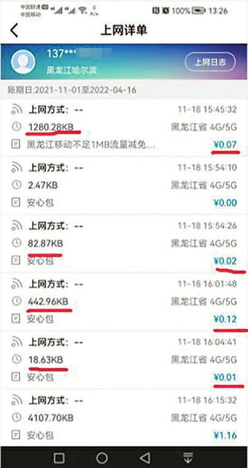 记者从刘先生提供的短信信息、收费账单和上网详单中看到:2019年7月至10月、2020年5月至12月,每月月初都有中国移动的短信通知,显示流量从0.01至0.03MB不等,当月分别被收取了0.01元、0.02元,最多一个月收取了1.05元。2021年,有几次虽短信通知产生0.01MB流量但未收费;11月没有流量通知却收取了1.50元流量费,从该月上网详单可以看到,11月18日至30日,“安心包”上网共44次,流量数以KB计算,当月“安心包”流量产生收费记录7次,共收取1.50元,其中最多一次产生流量4107KB、收取1.16元;最少一次产生流量0.05KB、收取0.01元。令记者不解的是,这7次收费标准五花八门:按1MB=1024KB、0.29元/MB计费,0.05KB怎么也得不出0.01元;其他30多次上网产生的流量均超过0.05KB,却未收费;1280.28KB收费0.07元,443.96KB却收取0.12元。