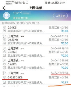 记者通过刘先生提供的上网详单还发现,4月11日一次上网产生流量9.86KB、收费0.01元,而4月6日上网产生流量20.20KB却未收费。