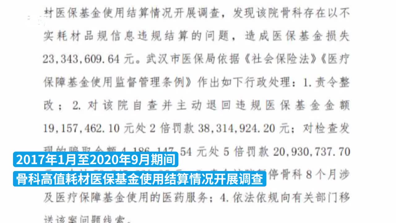 以不实耗材信息结算致医保基金损失,武汉同济医院被罚数千万