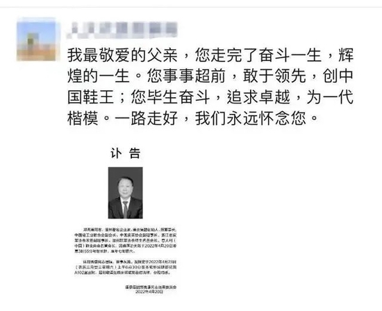 今日,温州著名企业家,康奈集团创始人、原董事长郑秀康之女在社交平台上发文宣布了其父离世的消息。