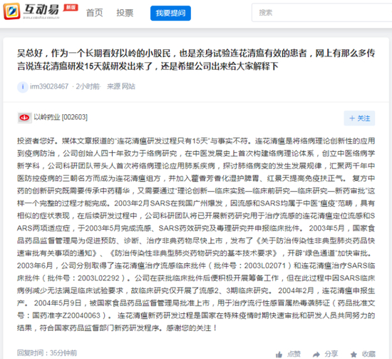 以岭药业相关舆论一波未平一波又起,最近,有媒体报道“连花清瘟研发一共只用了15天”,讨论度越来越大。18日开始,不断有投资者在互动平台向以岭药业询问相关事项。