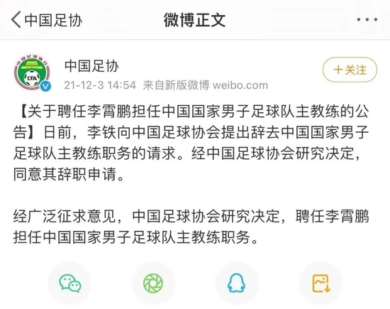 宣布李铁辞职的同时,中国足协也宣布,李霄鹏将担任新一届国家队主教练。李霄鹏是同辈人,也是那个年代的参与者和见证者,在2019年底的竞聘中输给了李铁。这一次,他的上任是由体育总局钦点的。李铁下课前,李霄鹏就被总局领导叫到北京——即便李铁不主动辞职,也难逃下课的命运。