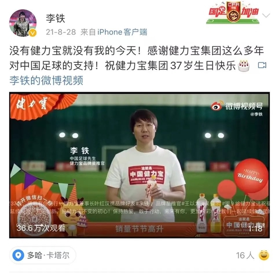 从时间节点上来看,李铁12强赛开打以来连续“带货”,更像是一份长期合同的约定,也是他坐上国足主帅位置的褒奖和互惠。李铁曾说,他和李宁合作十几年,从未中断过。他率队打入12强赛后,李宁为其送上了一份终身代言合同,推出了专有球鞋——这种待遇,只有NBA球星韦德享有过;健力宝集团在他成为国足主帅后聘请他为品牌星推官,趁热推出了李铁联名饮料罐,罐上有他穿着印有“健力宝”运动服踢球的照片,一旁还写着“老铁加油”,而雨林古树茶则在2017年就推出了有关他的铁饼茶,售价670元一罐。