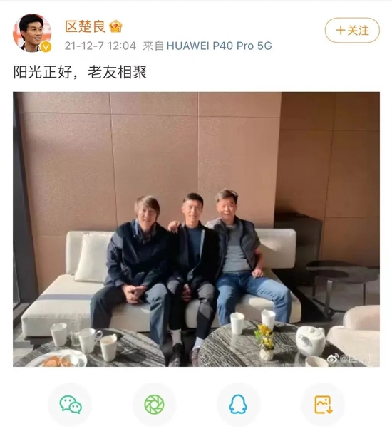 14天隔离解除后,国家队在上海进行健康监测,李铁和李霄鹏就此进行了工作交接,区楚良也在现场。12月7日,作为大哥的他拉着两人在酒店大堂沙发上合影,区楚良坐在最中间,他的右边是李铁,左边是李霄鹏。李霄鹏将手搭在了区楚良肩上,李铁则双手合十,端正地放在前方。
