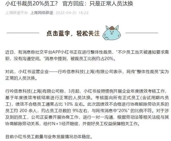 4月21日晚间,微信公众号“上海网络辟谣”称,小红书运营企业——行吟信息科技(上海)有限公司表示,网传“整体性裁员”实为正常的人员汰换。