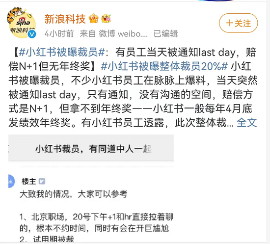 “有的人甚至当天上午才被通知,下午就可以走人了。”爆料称,虽然HR通知的理由各不相同,但被裁的小红书员工的赔偿方案大都一致:“N+1”的赔偿,没有年终奖和绩效奖金。其中有一位员工还质疑被要求在4月29日离职,就是因为公司不想给年终奖(原定于4月30日发放)。