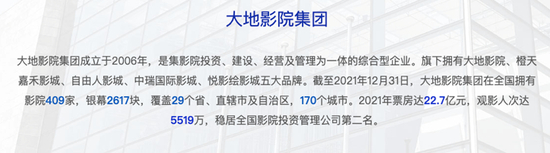 大地影院集团旗下有大地影院、橙天嘉禾影城、自由人影城、中瑞国际影城、悦影绘影城等品牌。2021年其影院票房为22.7亿元,观影人次5519万,居全国影院投资管理公司第二名。