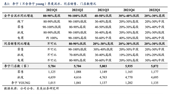 但同时,增速下滑也成为了市场更关注的问题。东吴证券研报显示,2021年Q1-Q4,李宁(不包括李宁YOUNG)全平台流水增速分别为80%-90%高段、90%-100%低段、40%-50%低段、30%-40%低段。