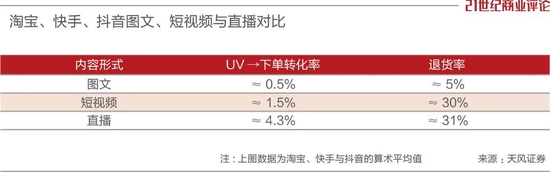 据天风证券研报,直播带货的UV(浏览用户)下单转化率为4.3%,图文内容仅有约0.5%。