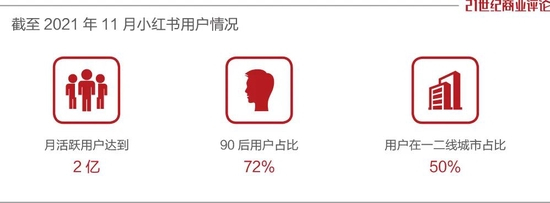 据官方数据,小红书在2019年10月,月活用户过亿,仅用2年时间,到了2021年11月,月活达到2亿。平台用户中,72%是90后,50%的用户在一二线城市。