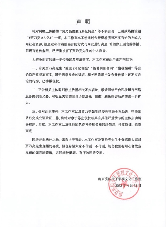 声明还称,有关贾乃亮“隐匿2.6亿佣金”“签署阴阳合同”“偷税漏税”等言论均严重背离事实,属于恶意捏造的谣言。相关网络用户发布并传播上述不实言论的行为,已涉嫌侵权。工作室及贾乃亮已委托律师全权处理,将针对怠于停止侵权或具有其他严重情节的主体启动诉讼程序。