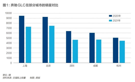 2021年,在奔驰GLC销量最高的五座城市,上海、北京、深圳、成都和杭州的奔驰GLC销量出现集体下滑,幅度分别为-23.3%、-19.7%、-27.5%、-22.9%和-11.9%。而同样的情况也出现在了奔驰C级和E级上。
