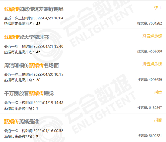 云合数据显示,与《甄嬛传》相关的词条在4月仍频频登上抖音、快手等短视频平台的热搜榜单。在优酷上,《甄嬛传》近一个月的热度依旧保持在8000左右。