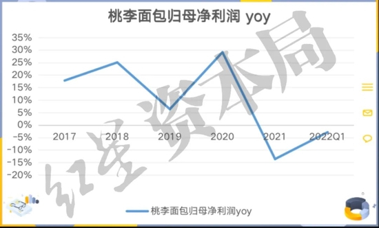 2022年第一季度,桃李面包的净利润再次下滑。财报显示,2021Q1企业净利润为1.58亿元,同比下降2.80%。