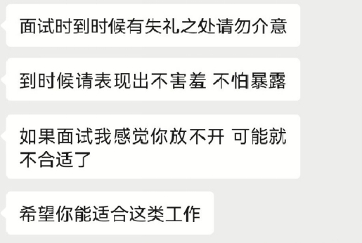 招聘人员称,正式拍摄前有个培训和面试。面试需接受全裸,需要查看胸型等身体隐私部位。并且,面试人员会查看私密部位。而这位面试人员,就是最开始小周接触的那位。对方表示,面试时会有失礼的地方希望小周不要介意,如果感觉放不开就是不合适。