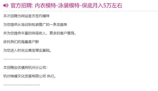 小周说给记者提供了一个对方发给她的一个官方招聘内衣模特的链接,链接上写着招聘目的是为淘宝、京东、天猫等电商商家和服装企业提供内衣、泳装、情趣内衣的服装拍摄。该链接的栏目上,写着“优模网”。