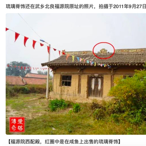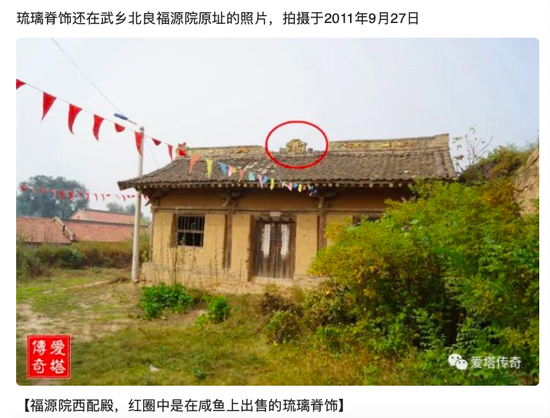 4月28日,历史领域博主@爱塔传奇 在微博称,有人在闲鱼上公开售卖全国重点文物保护单位山西长治武乡北良福源院的琉璃脊饰。该博主表示,11年前,其在当地拍摄到福源院西配殿上的琉璃脊饰,该脊饰上还有元泰定元年(1324年)题记,基本完整,只有少量缺失。