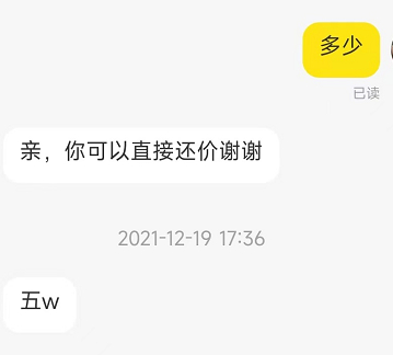 卖家在闲鱼上回复价格“五w”。