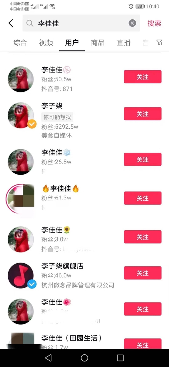 在抖音上搜索“李佳佳”可以发现,会出现很多同名的账号,有的粉丝几个,有的粉丝几千,有的也有几十万,而很多账号还是用的李子柒头像。