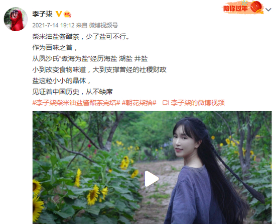 2021年7月14日,李子柒发布了关于“盐”的视频,此后便停更了,至今已有290多天。