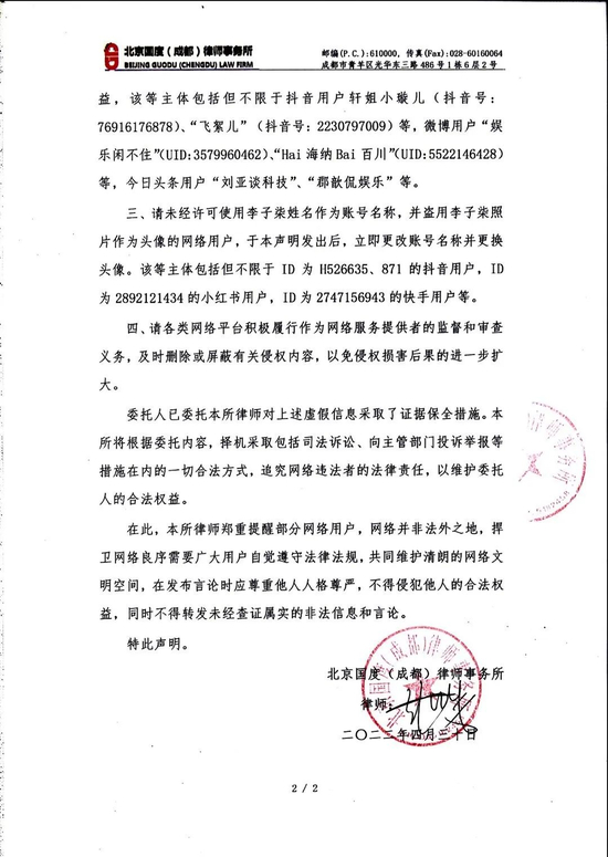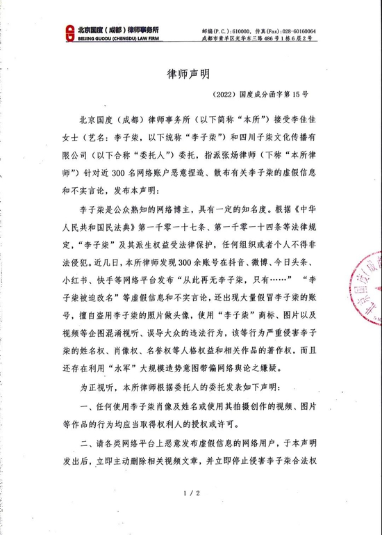 声明称,近几日发现 300 余账号在抖音、微博、今日头条、小红书、快手等网络平台发布“从此再无李子柒,只有……”“李子柒被迫改名”等虚假信息和不实言论,还出现大量假冒李子柒的账号,擅自盗用李子柒的照片做头像,使用“李子柒”商标、图片以及视频等企图混淆视听、误导大众的违法行为,该等行为严重侵害李子柒的姓名权、肖像权、名誉权等人格权益和相关作品的著作权,而且还存在利用“水军”大规模造势意图带偏网络舆论之嫌疑。