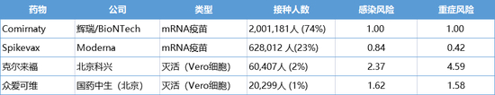 其中Comirnaty和Spikevax是mRNA疫苗,克尔来福️和众爱可维是灭活疫苗。