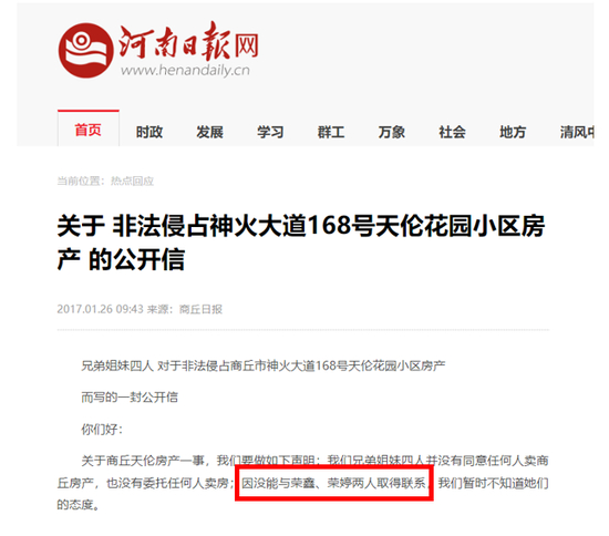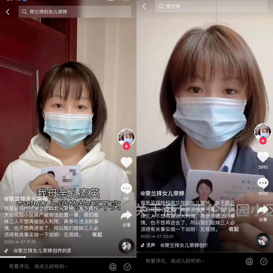 之后,时间线终于来到最近,2022年4月26日,荣兰祥的女儿荣婷(也是当年被父亲一手送进监狱的三个女儿之一)视频+长文实名举报母亲孔素英。内容包括非法处置商丘天伦花园小区房产、伪造房屋转让合同、涉嫌黑社会行为等。称其母在媒体上打造虚假人设,所说内容均不属实。