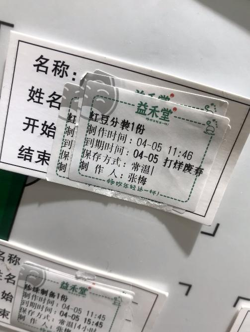 4月5日上午,调查人员第一次来到位于郑州的益禾堂中牟白沙店。调查人员看到,店内工作人员正在给过夜的橙片换标签以继续使用。这是“店内物料保鲜膜一封,第二天照用”的一个缩影,而且其中不乏已经“打烊废弃”的物料——4月5日打烊废弃的红豆,封上保鲜膜之后,4月6日继续使用;4月5日打烊废弃的红玉奶茶,4月6日上午9点多依然在用;店内麻薯、果汁、芋圆等都存在过期现象。