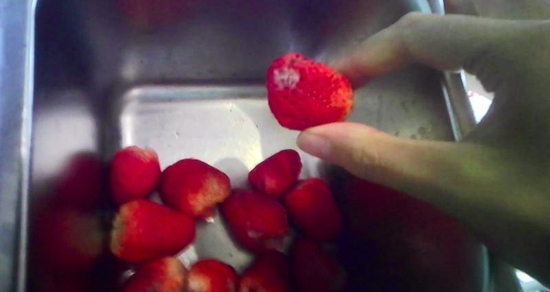 在长葛文化路益禾堂店,草莓表面发白继续使用。一名女店员在清洗草莓时说:“人家蛋糕店用的草莓比较好,像咱这种(茶饮店),草莓能用就好。”她也知道“草莓再放就要长毛了”。