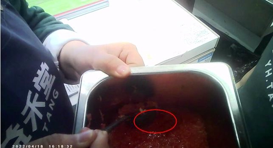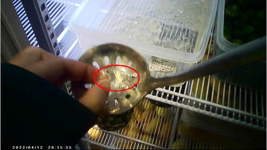 4月12日晚,新郑苑陵中学店,洋槐蜜冻里有异物,调查人员问店内工作人员怎么处理,得到了同样的回复:“把有异物那一块儿捞出来扔掉,其它的正常用。”
