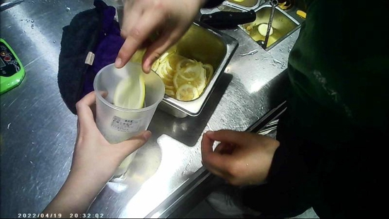 在长葛文化路店,店内工作人员存在不规范制作奶茶现象——不戴手套切柠檬、芒果和西瓜,切好柠檬片后徒手放入杯中。