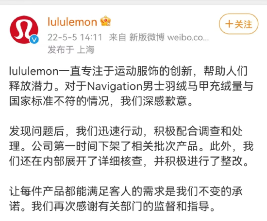 同日下午,#lululemon致歉#又登上热搜,其官方微博发文称,lululemon对于Navigation男士羽绒马甲充绒量与国家标准不符的情况深感歉意。