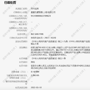 天眼查app显示,瑜伽裤品牌lululemon关联公司露露乐蒙贸易(上海)有限公司因违反产品质量法第五十条(在产品中掺杂、掺假,以假充真,以次充好,或者以不合格产品冒充合格产品),被北京市西城区市场监督管理局罚款8.1万余元、没收违法所得2.3万余元。