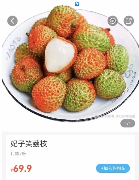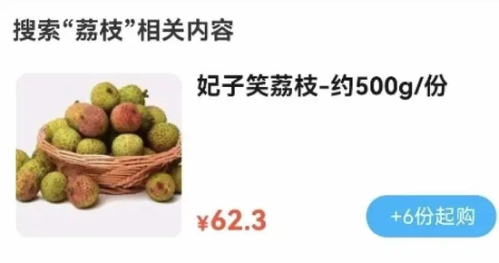 有的商家对500克妃子笑荔枝分别开出69.9元、62.3元、49.8元的价格,其中有家还是6份起购。