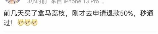 在盒马上海地区荔枝降价后,一些顾客陆续表示自己申请退还部分差价成功,有人退30%,有人退50%,几乎申请后秒成功。