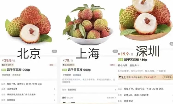 图中显示,一款妃子笑荔枝900克的价格,北京29.9元,上海79元,深圳450克19.9元。若将其统一折合成500克的价格,北京16.61元;上海43.89元;深圳22.11元。悬殊的差价,迅速引起网友热议。