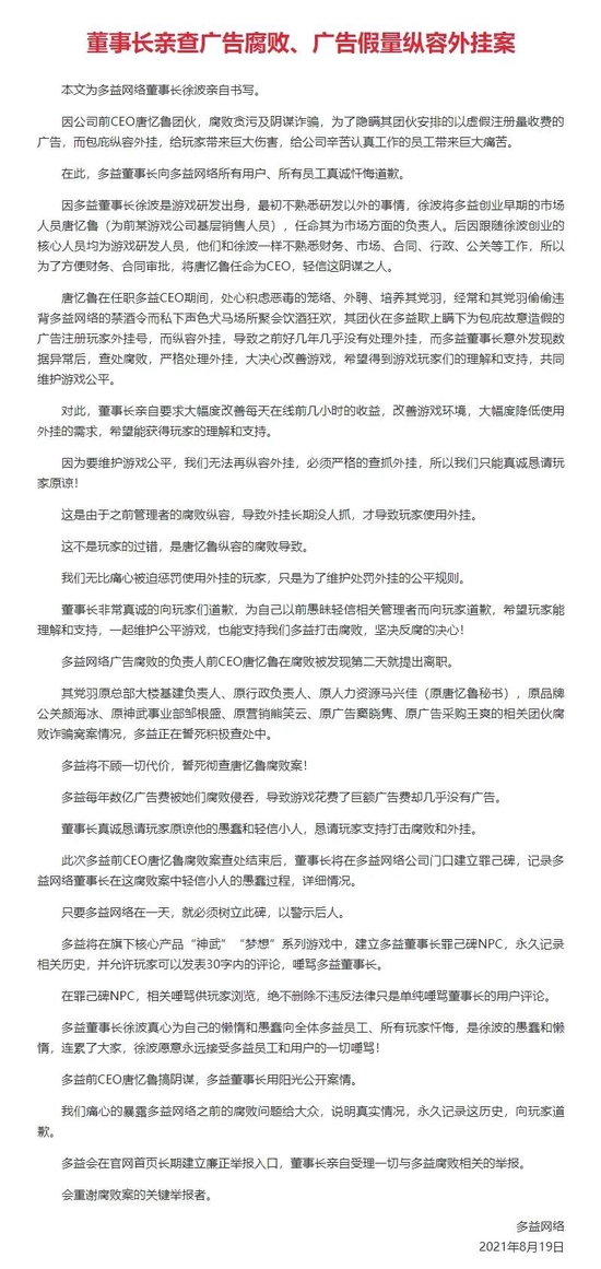 这篇名为《董事长亲查广告腐败、广告假量纵容外挂案》的亲笔长文被发布在多益官网和微博上,文章指出“前CEO唐忆鲁团伙涉嫌腐败,为了隐瞒其团伙安排的以虚假注册量收费的广告,包庇纵容外挂等,致使公司遭受巨额损失,给玩家带来巨大伤害”。文章称,唐忆鲁在腐败被发现第二天就提出离职。