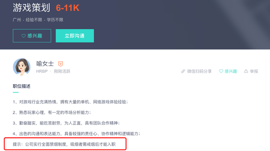 某招聘APP显示,广州一公司对机电预算员的招聘要求,称“公司实行全面禁烟制度,吸烟者需戒烟后才能入职”。有网友表示:表示可以理解在大厦内吸烟罚款的制度要求,但入职必须戒烟的规定无法理解。
