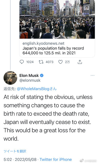 马斯克在5月8日针对日本人口减少和老龄化评论称,“除非出现变化致出生率超过死亡率,否则日本最终会不复存在。”马斯克的言论很快在日本网络上引发广泛讨论。