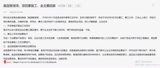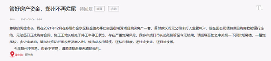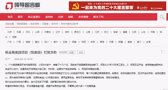 5月10日,郑州政府领导留言板有市民反馈,多市民表示自己为绿地香湖湾的业主,目前由于奥园集团资金链断了,奥园御湖湾项目从21年10月停工至今。现在开发商拖欠施工款,材料款,监管账户资金被转移,存在严重烂尾风险。希望政府帮我们做主,尽快调查楼盘问题,调查开发商资金问题,不要再让郑州多一个烂尾楼盘。目前该信息,处于待回复状态。