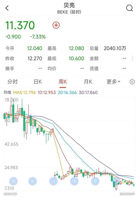重压之下,贝壳的股价也一路走低。截至2022年5月9日收盘,贝壳报11.37美元/股,总市值136.11亿美元。相比于去年2月的高点,贝壳市值已缩水超过80%。