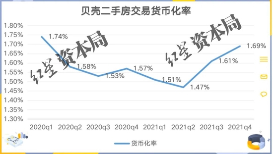 用二手房业务收入金额除以总交易金额,会得出二手房业务的货币化率,贝壳这个数据在2021年在悄悄发生了变化。
