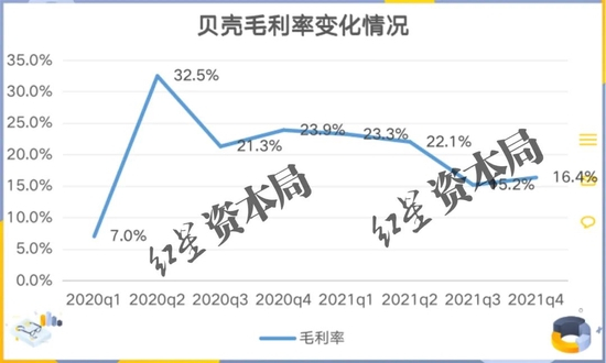 从2021年各季度表现来看,除了第一季度之外,其余三个季度贝壳毛利率同比2020年都出现下滑。其中,2021年第三季度和第四季度,贝壳毛利率分别为15.2%和16.4%。