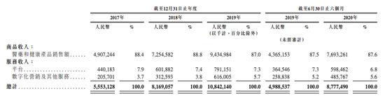 招股书显示,京东健康的营收主要分为商品收入和服务收入两部分。其中“商品收入”指的是医药和健康产品业务,这部分产品的主要售卖渠道为公司自营的京东大药房,也是公司营收中占比最大的部分;从2017年至2019年,营收占比分别高达88.4%、88.8%、87.0%。2020年,该项业务收入为168亿元,占总营收的比例约为86.7%。
