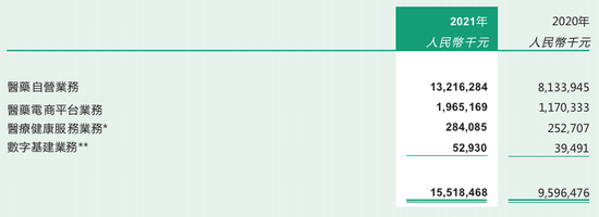 可以佐证的是,京东健康的“老对手”阿里健康,在2021财年的医药自营业务收入达到了132.16亿元,占公司总营收比例达85.17%。但是,公司公开对外宣称,其中药品收入占比达到64.8%,显然,它看起来比京东健康更像是一家“正经的卖药”公司。