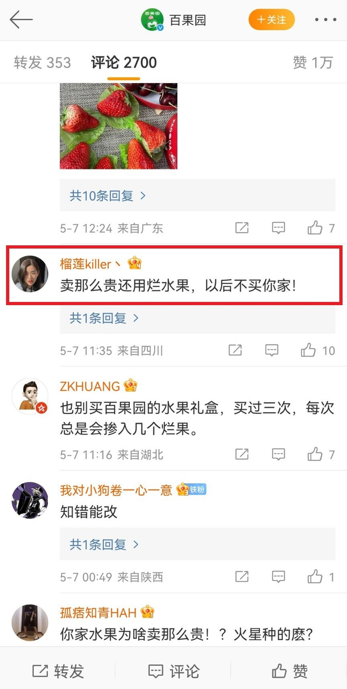 也正是因为立下了“flag”,许多网友格外不能接受此次“烂水果”事件。有网友甚至留言称:“卖那么贵还用烂水果,以后不买你家!”