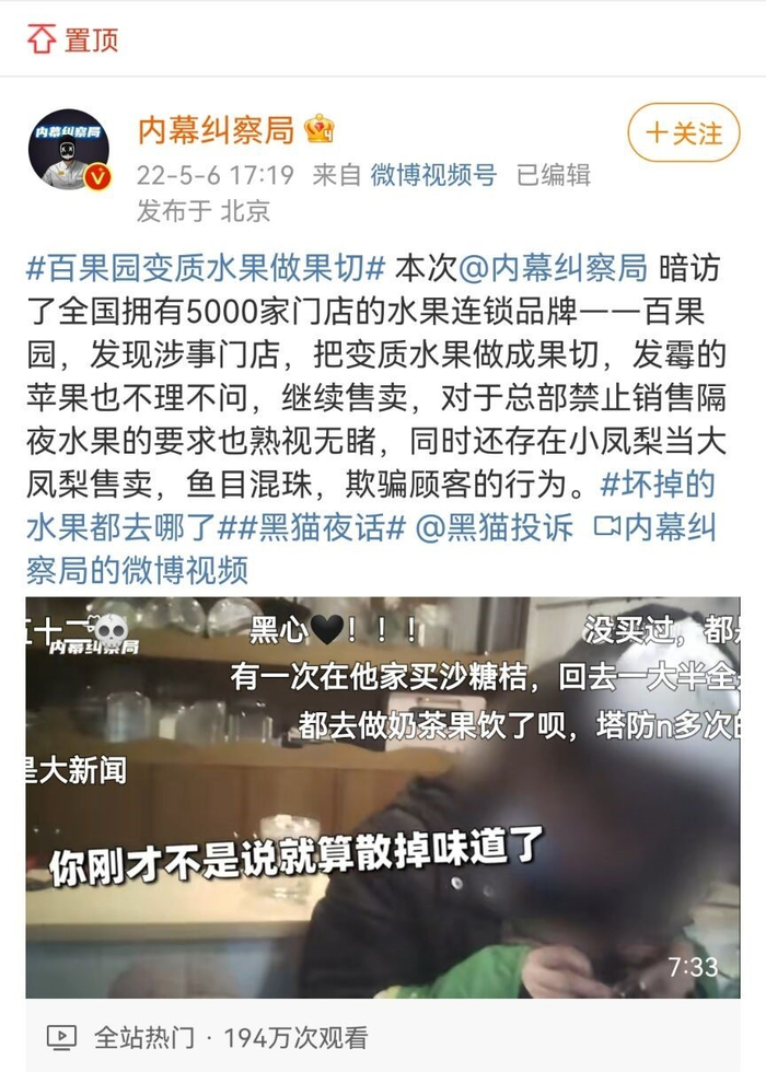 5月8日,上海市消保委官方微信公众号发布《把变质水果切块卖!百果园上市前曝出丑闻,加盟店的身份是否向消费者明示?》一文。文中称:“品牌不能一味追求扩张速度,而疏于对加盟店的管理和监督。”