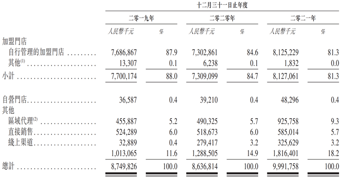 当前,百果园门店数据和销售额均距离目标还有一定差距,但加盟门店已经是公司的主要收入来源。“我们收入的绝大部分由加盟门店贡献”——百果园招股文件显示,2021年,公司实现营收102.89亿元,其中水果及其他产品销售额为99.92亿元,占据主要部分。而这99.92亿元的收入中,加盟门店贡献了81.27亿元,占比超过八成。