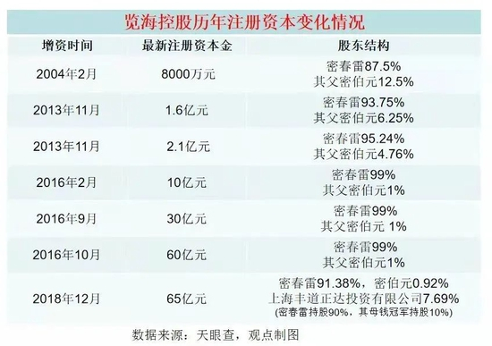 2014年,上海中瀛更名为览海控股,先后通过七次增资,将注册资本由5000万增加到了65亿。